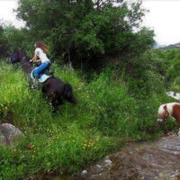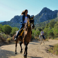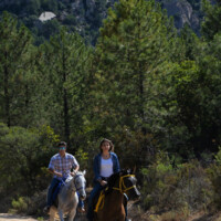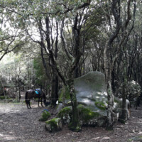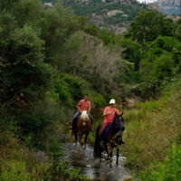 Auf den Spuren der verborgenen Insel, reiten wir diesmal auf breiten Sand – sowie Viehtreibwegen, an Granit- Bergwänden vorbei, Pinienwälder, enge Pfade und durch atemberaubende Canyons zum Monti Santu Berg. Von ganz oben erwartet uns sogar ein Blick aufs Meer! Der erste Teil der Tour führt uns hoch in die Berge mit seinen bizarren Felsformationen. Danach reiten wir weiter bis nach Santu Santino, wo wir unsere Lunchpause inmitten eines „Elfenwaldes“ mit seinen hundertjährigen Eichen und von Moos überzogenen Rundfelsen machen. Hier fließt das Naturquellwasser, das aus der Gesteinswand bis in den Fluss mündet, sogar im Sommer noch.