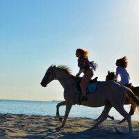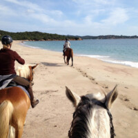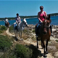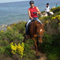 Unser Highlight zum Schluss, Meer und Strand! Unsere Pferde sowie Reiter werden zur Liscia Ruja Küste transportiert. Dort reiten wir auf einem breiten Sandweg bis zum gleichnamigen Strand. Für Sattelfeste gibt’s einen flotten Galopp ansonsten ist auch im Schritt das traumhaft blaue Meer ein Genuss. Weiter führt der Weg zu einem engen  Pfad an den Klippen vorbei mit atemberaubendem Blick von oben auf das offene Meer. Im Frühling säumt der wilde Ginster mit seinen gelben Blüten unseren Weg.