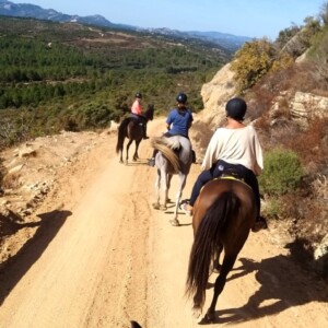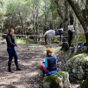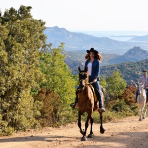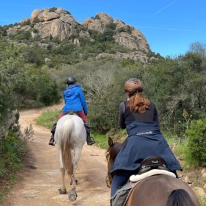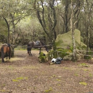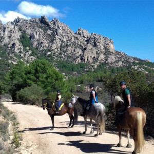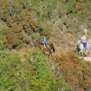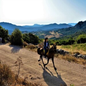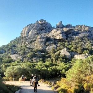 We invite you on a wonderful full day ride to the Monti Santu Mountain, the “magical mountain”. On field paths and trails we ride past hidden farms, through pine forests, groves, rocky slopes and granite mountains with breathtaking views, the Sardinian Rocky Mountains, so to speak. We continue uphill until we reach Santu Santino, where we take a brunch break. In this enchanting forest of wild olive trees and ancient oaks, the water still flows in the stream even in summer, and the huge, moss-covered round rocks with their bizarre shapes are reminiscent of a “fairy forest”. Wild boars, falcons and eagles are also at home here, and with a little luck you can see them. After about an hour’s break we set off again, along the serpentines that lead us down into the canyon to return to the valley.